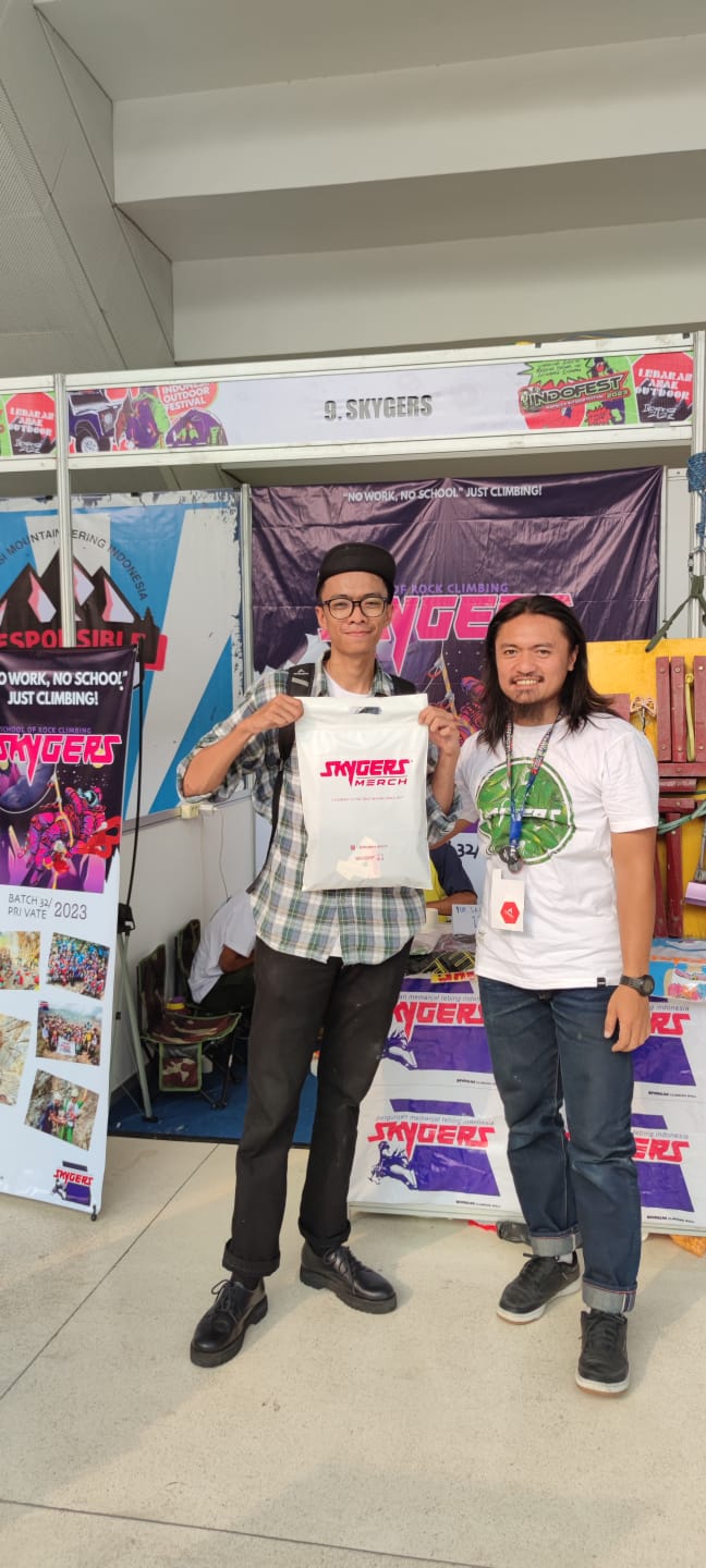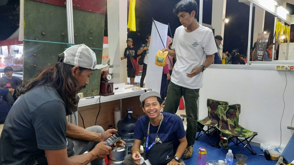 Hasilnya pagi hari tadi, tanpa ijin si empunya dan panitia, kami membongkar sekat booth sebelah milik FONI (Federasi Orienteering Nasional Indonesia) yang memang sudah rungkad sejak hari pertama karena kegiatan nongrong kami yang kelewat barbar. Ternyata, si Akang dari FONI gak marah dan justru senang karena akhirnya kami bisa nongkrong bersama tanpa sekat mencong yang menyebalkan. Mohon ijin pada Mas dan Mbak panitia, itu gak tau kenapa sekatnya jadi mencong, sumpah bukan disengaja, daripada bahaya jadi kami buka aja sekalian 🙏🙏.
