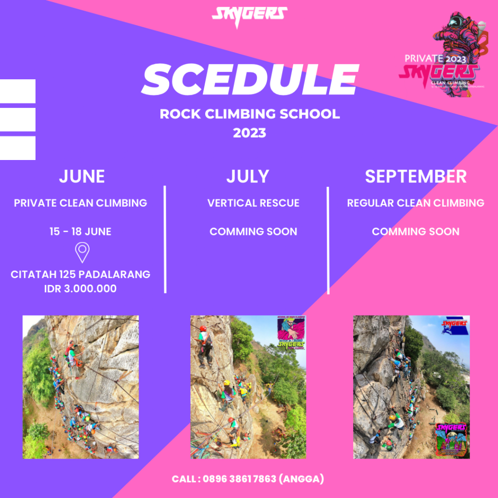 Skygers kembali membuka sekolah panjat tebing, dimana rangkaian kegiatan tersebut akan dilaksanakan mulai pertengahan Juni hingga akhir September 2023.