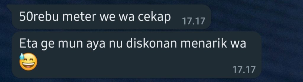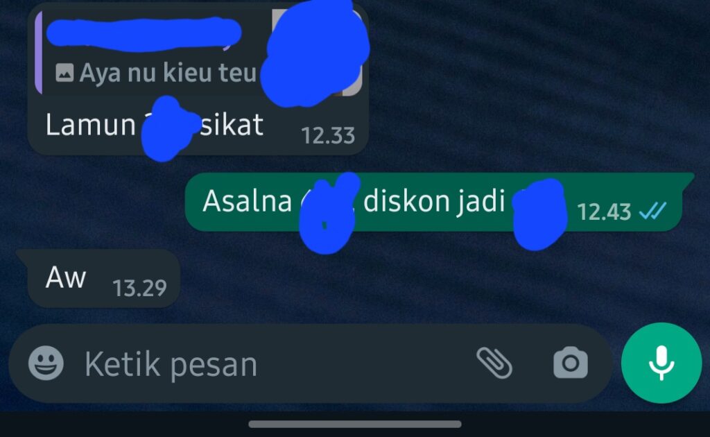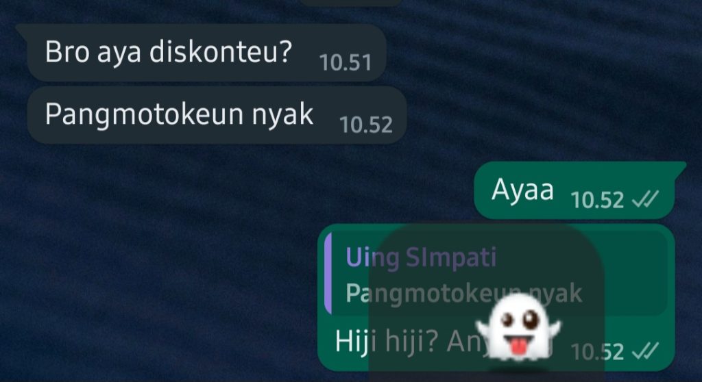 Salah satu percakapan yang terjadi ketika ekspektasi melambung ke langit tinggi, meninggalkan realita yang tak beranjak dari dasar bumi. Entah memang niat beli, atau cuma basa basi. Dilihat dari percakapan tanpa sensor, saya berani bilang, beliau memang mengharapkan harga yang sungguh keterlaluan. Haduh, malu maluin aja ih.