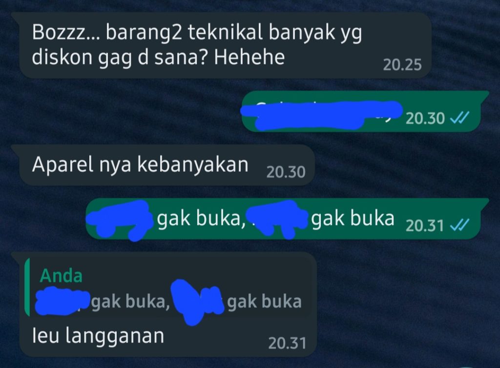 Yang Mulia satu ini lumayan bikin emosi. Belio pikir kami ini abdi dalem nya kali. Plis dong Bos, sebelum pesen itu tolong riset sendiri dan rikues barang dengan spesifik. Inimah duh parah, kayak pengen jalan jalan tanpa harus ke lapangan. Kalian pasti kesel juga ‘kan? Dengan maksud mewakili perasaan anda semua, khusus untuk yang satu ini, jawaban kasar dalam tangkapan layar sengaja tidak saya sensor.